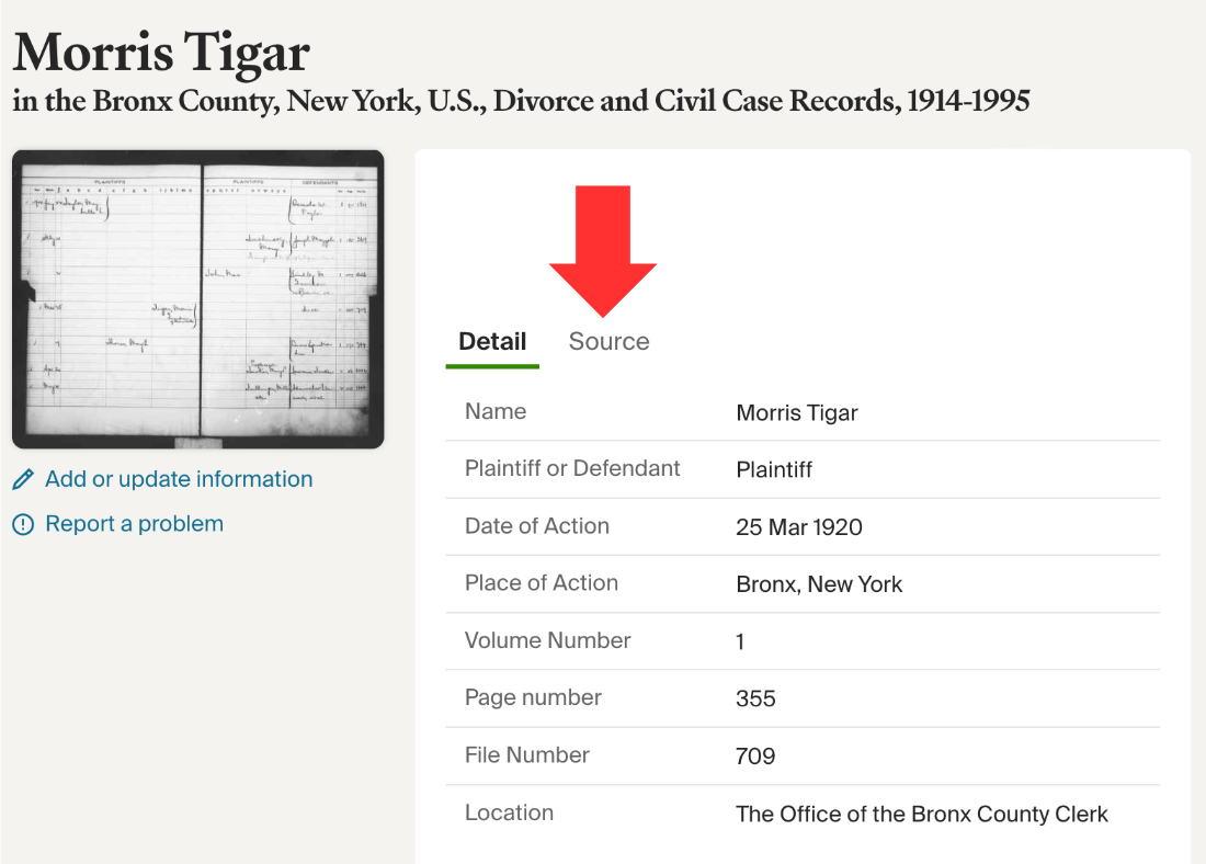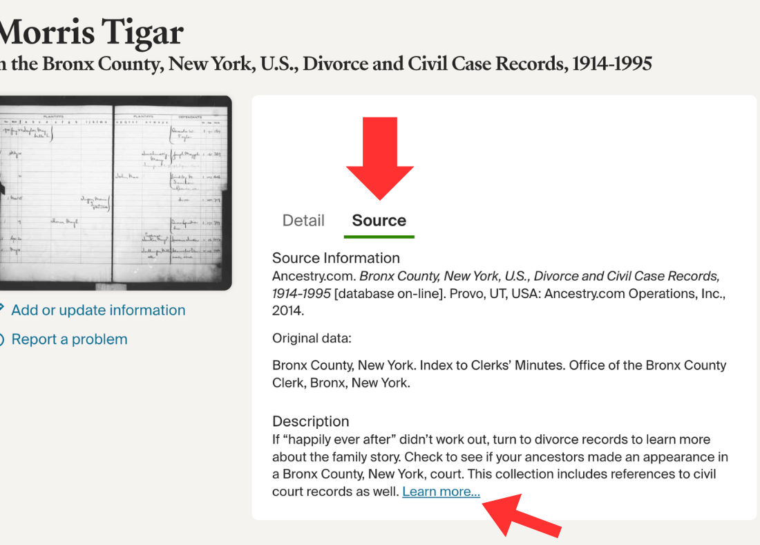 I clicked the “Source” tab on the hint. You should always click on the source information to learn more about the record. It will tell you exactly where the record originated and provide instructions on how to obtain more information.